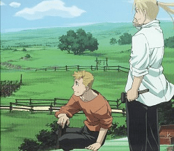 Awesome set, right? These are all scenes, big horizontal images with backgrounds and something going on. I just arranged them myself so it’s not an official grouping. Some of the images aren’t clean, sadly but they’re still pretty awesome and many feel like shots from a particular episode. (Though one looks suspiciously like Fullmetal versus Flame, as if there wasn’t already plenty of 03 art on that fight. Seriously there’s loads of Ed and Roy fighting in 03 official art.) My favourite is probably the one with Young Hohenheim and Ed.